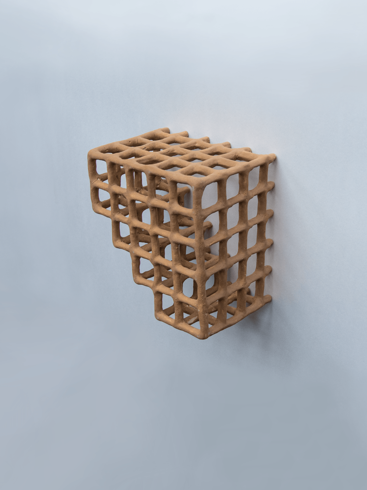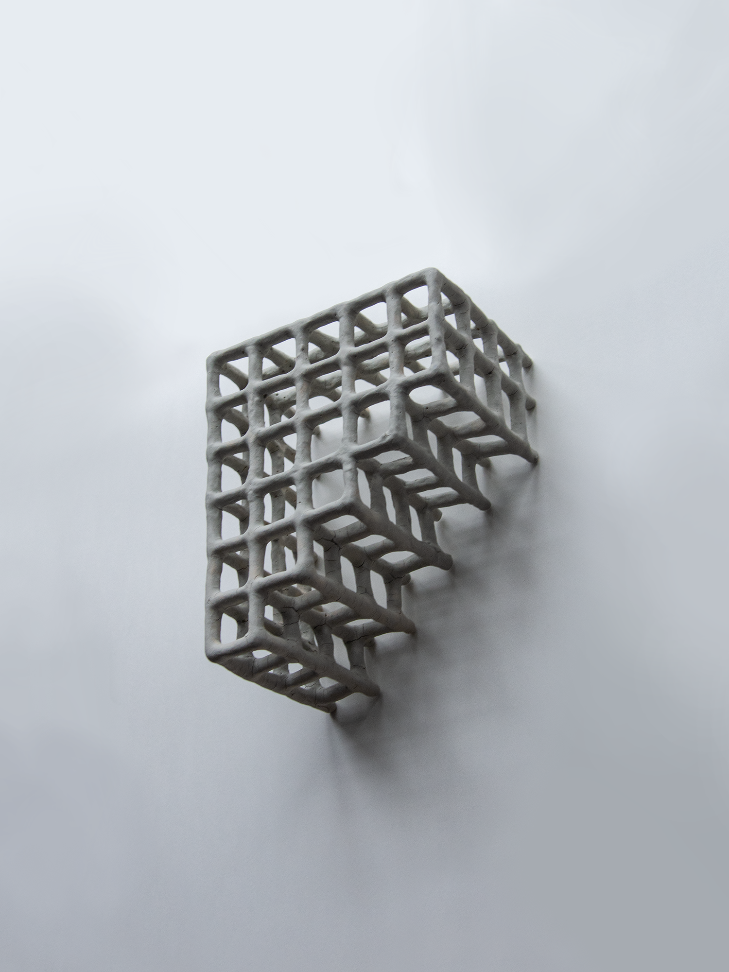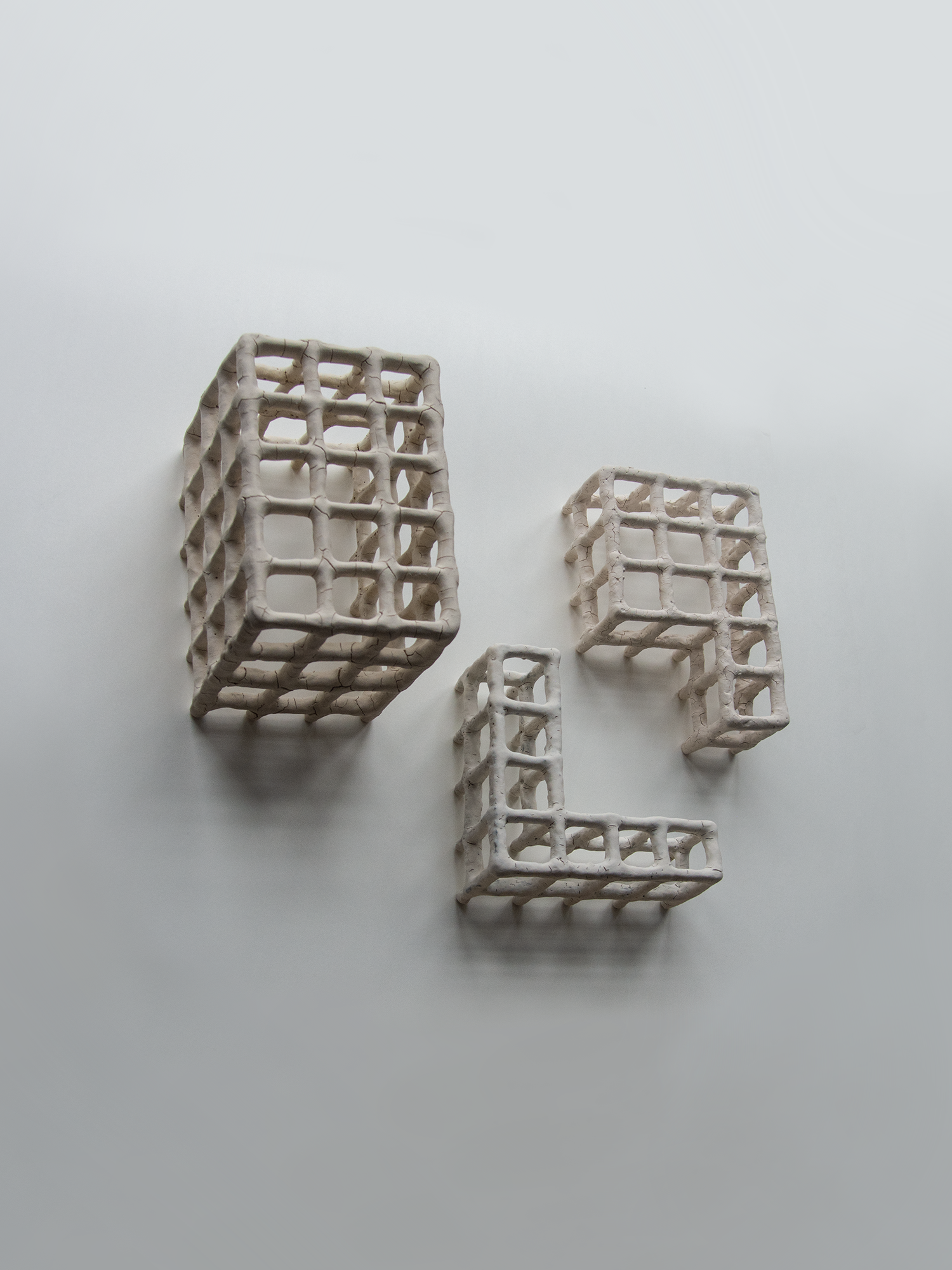 These ceramic sculptures blend the malleability of clay with the form of a structure, inspired by her interest in architecture. Using clay grids create a geometric yet organic appearance. The grid divides and encompasses the spaces and appears to sculpt air. The title of each piece represents the volume the object occupies.