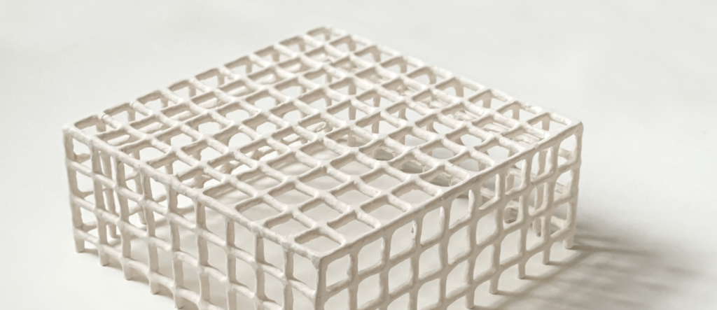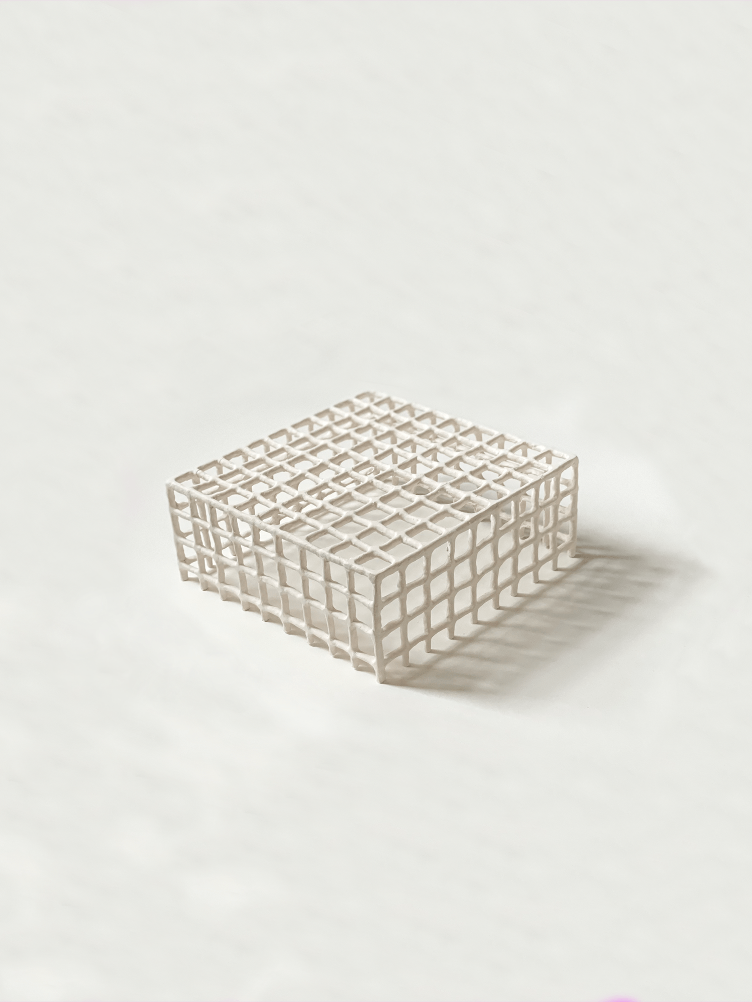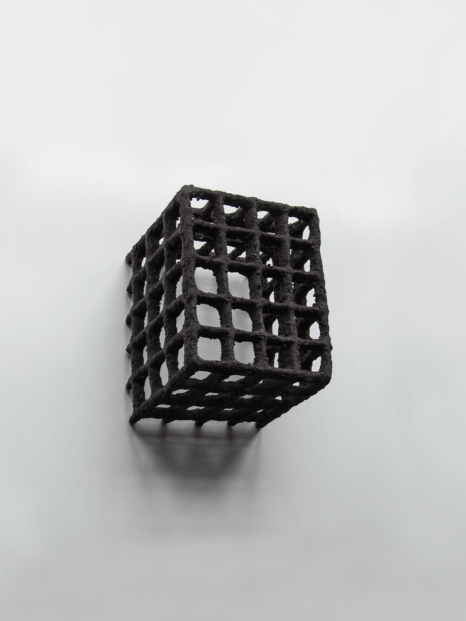 These ceramic sculptures blend the malleability of clay with the form of a structure, inspired by her interest in architecture. Using clay grids create a geometric yet organic appearance. The grid divides and encompasses the spaces and appears to sculpt air. The title of each piece represents the volume the object occupies.